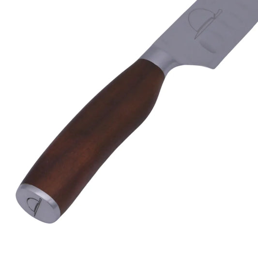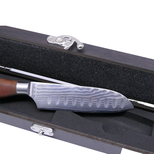L’une des caractéristiques du Santoku est sa lame légèrement incurvée, qui permet un mouvement de coupe fluide et précis. Cette polyvalence en fait un outil indispensable dans toutes les cuisines, offrant une excellente alternative au couteau de chef occidental.